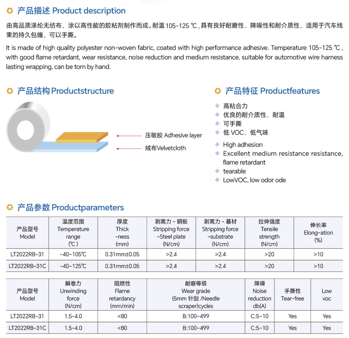 由高品質滌綸無紡布,涂以高性能的膠粘劑制作而成。耐溫105-125℃,具有良好耐磨性、降噪性和耐介質性,適用于汽車線束的持久包纏,可以手撕。